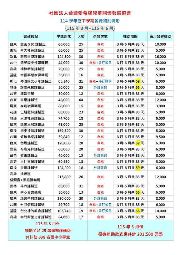 115年3月補助全台共29處課輔班據點,扶助共638名國中/國小學童週一至週五營養晚餐。