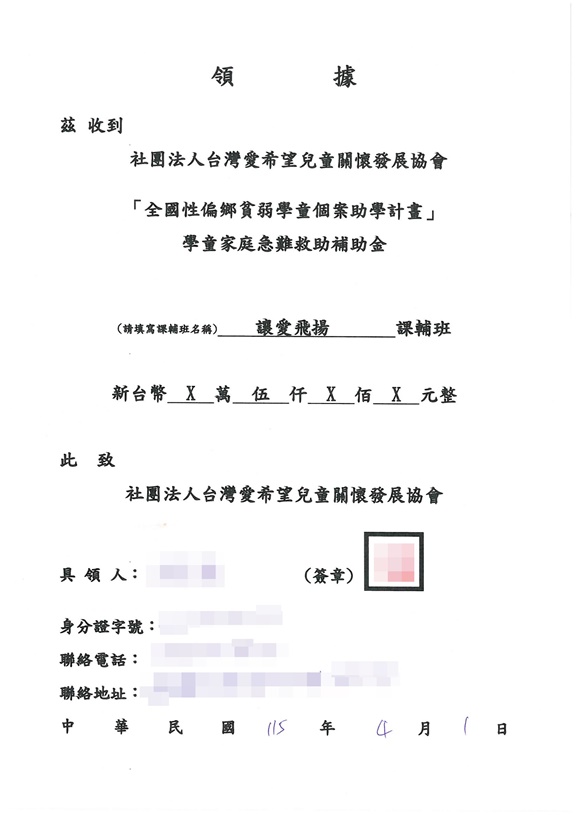 花蓮讓愛飛揚課輔班轉介個案弱勢學童 - 家庭急難救助補助款發放