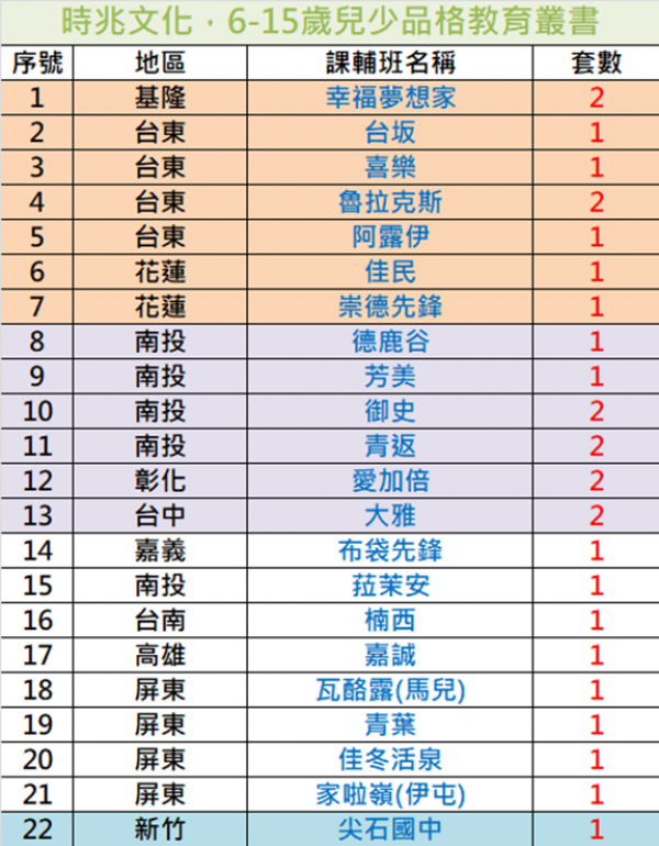 今年再度捐贈【時兆6-15歲弱勢品格教育叢書】給全台多處偏鄉課輔班據點。