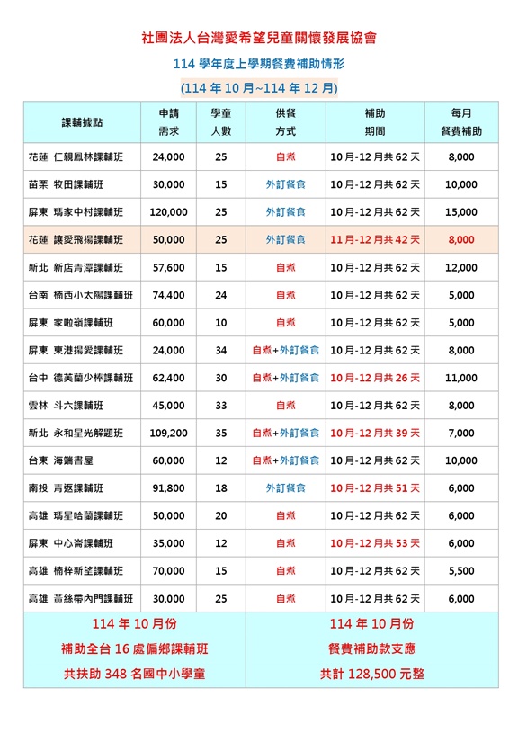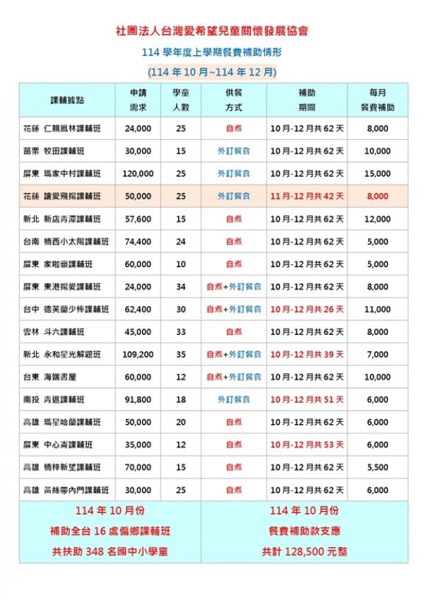 【偏鄉弱勢兒童課輔班-營養餐費扶助計畫】2025年10月份執行成果