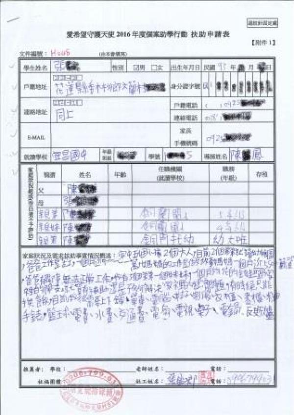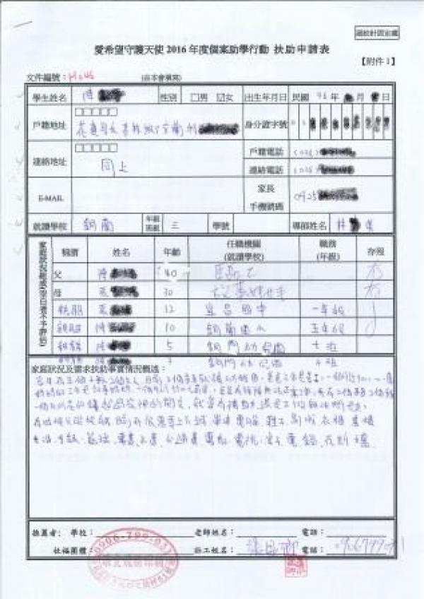 案父患有先天性殘障,沒辦法像正常人一樣工作,也因為居住地區實在很偏僻,沒有穩定的工作機會,只能做臨時工來賺取家裡的開銷,月收入9000~10000不等。案母則因為需要照顧三歲與五歲弟弟,目前擔任故事媽媽,每月領近5500的薪資,家裡一個月總收入不到一萬五千元,也沒有親人可以幫助。