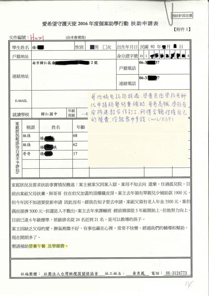 台南市歸仁區 楊同學 個案協助