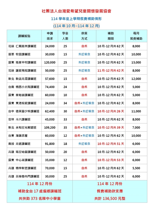 heart『114年12月補助全台共17處課輔班據點』