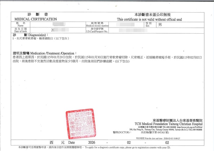 媽媽雖一個人辛苦的工作照顧兩個孩子,仍是把家裡整理的乾淨整齊給孩子們一個溫暖的家。但因家族遺傳性疾病導致阿同的右手腕到手肘長了一顆骨瘤,在骨瘤的擠壓之下導致阿同的骨頭變形嚴重影響到日常生活,經過醫生的診斷評估,需要開刀並安裝人工骨頭才能讓阿同恢復到正常生活。